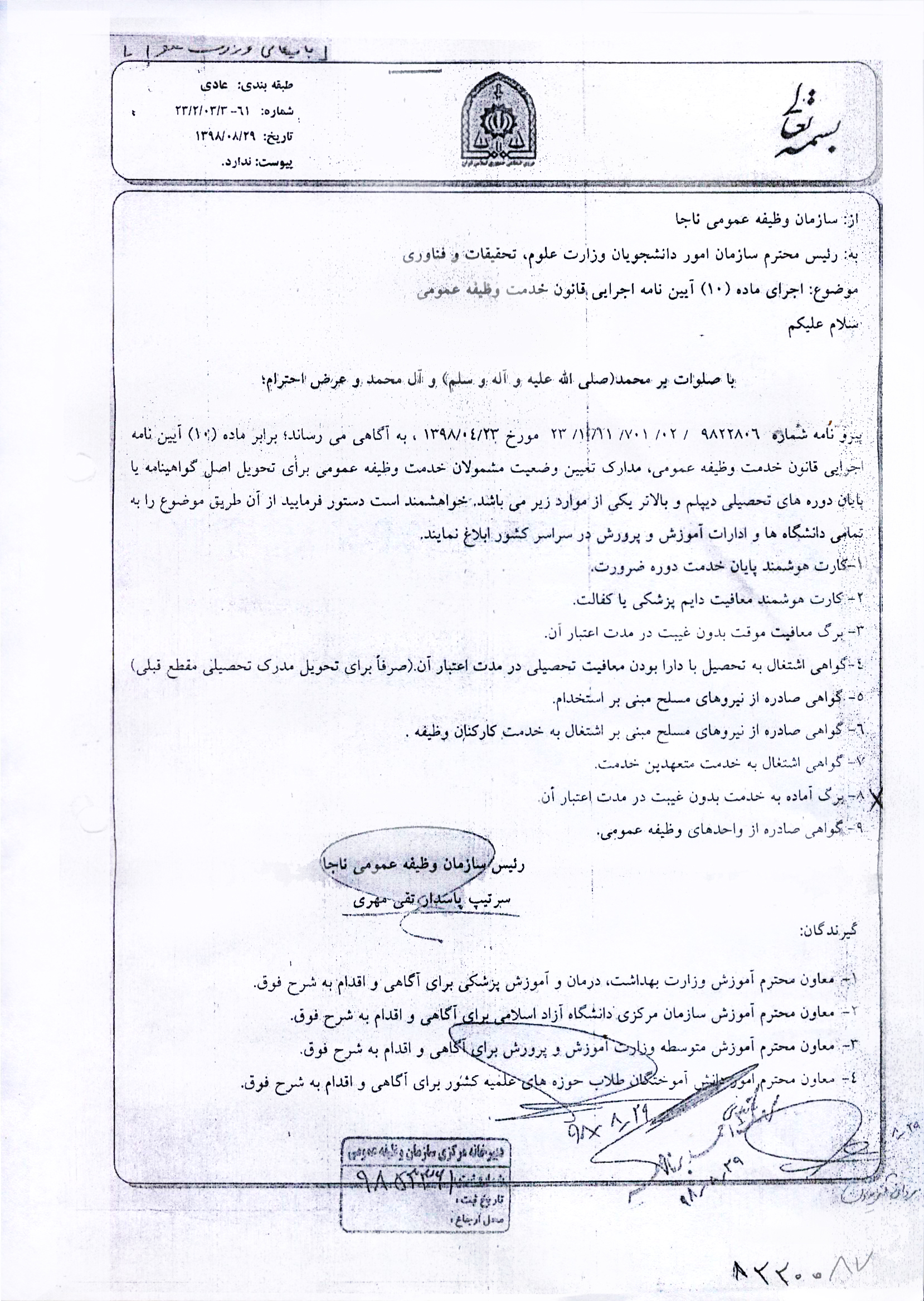 دانش آموخته گان محترم در صورت ارائه یکی از مدارک مندرج در بخشنامه ذیل مبنی بر مشخص شدن وضعیت وظیفه عمومی، مجاز به دریافت اصل گواهی پایان تحصیلات می باشند.
