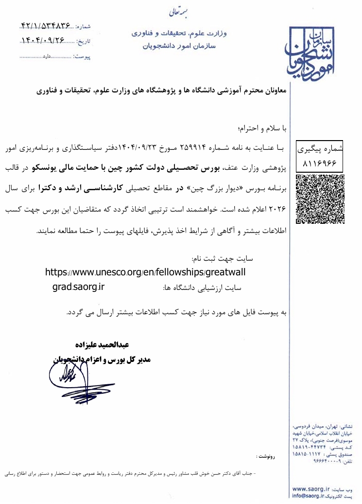 فراخوان بورس تحصیلی دولت کشور چین با حمایت مالی یونسکو